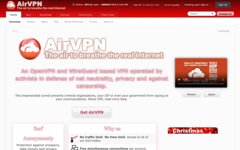 Privacy-Oriented Policies: AirVPN advertises no monitoring and no logging of activities, supports account creation without providing personal data, and accepts cryptocurrencies (Bitcoin, Litecoin, Monero, etc.) to increase anonymity.