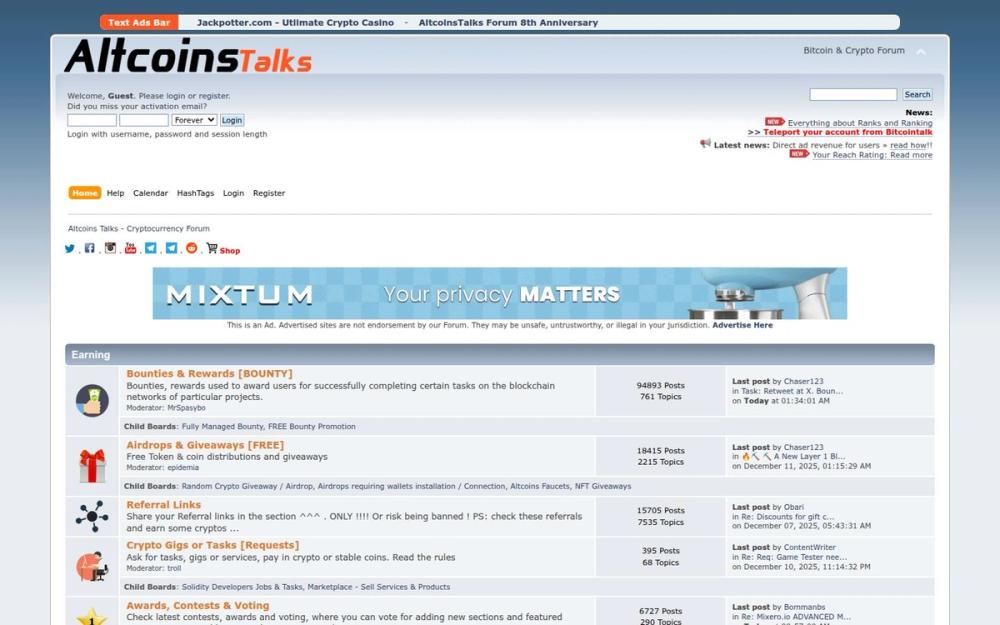 Altcoins Talks is an established, community-oriented cryptocurrency forum that brings together enthusiasts, developers, traders and project teams around altcoins and digital assets. The platform is organized like a traditional message board with a hierarchical set of boards and child boards that cover specific coins, sectors (DeFi, NFTs, GameFi), and services (exchanges, wallets, mining). It combines discussion, news, and promotional tools — notably bounty campaigns and airdrops — that many projects use to engage users and distribute tokens.