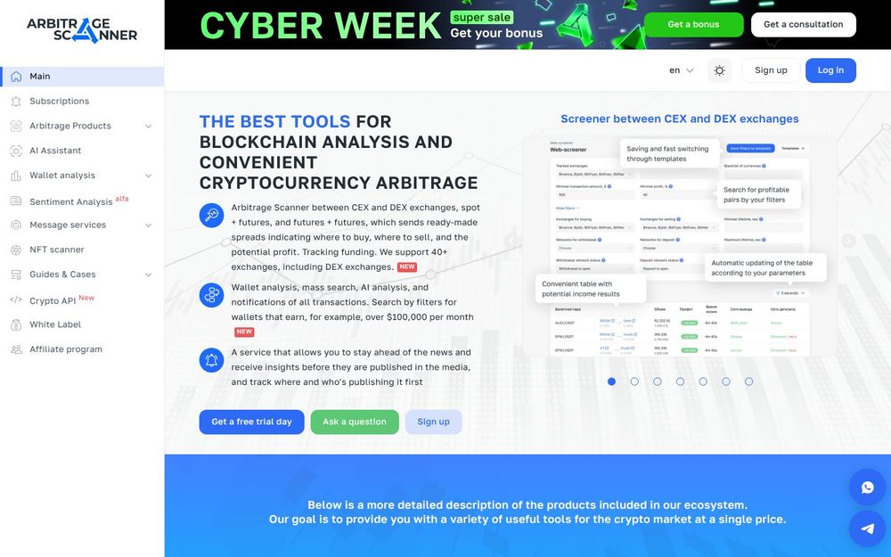 Arbitrage Scanner is a specialized analytics and notification platform designed to help crypto traders discover actionable spreads and on-chain intelligence. The product combines a multi-exchange arbitrage scanner (covering both CEX and DEX markets), tailored tools for spot/futures/perpetual strategies, and an extensive suite of wallet analysis features. It is delivered primarily through Telegram-driven cloud interfaces and complementary web dashboards, emphasizing manual execution, safety, and user education.