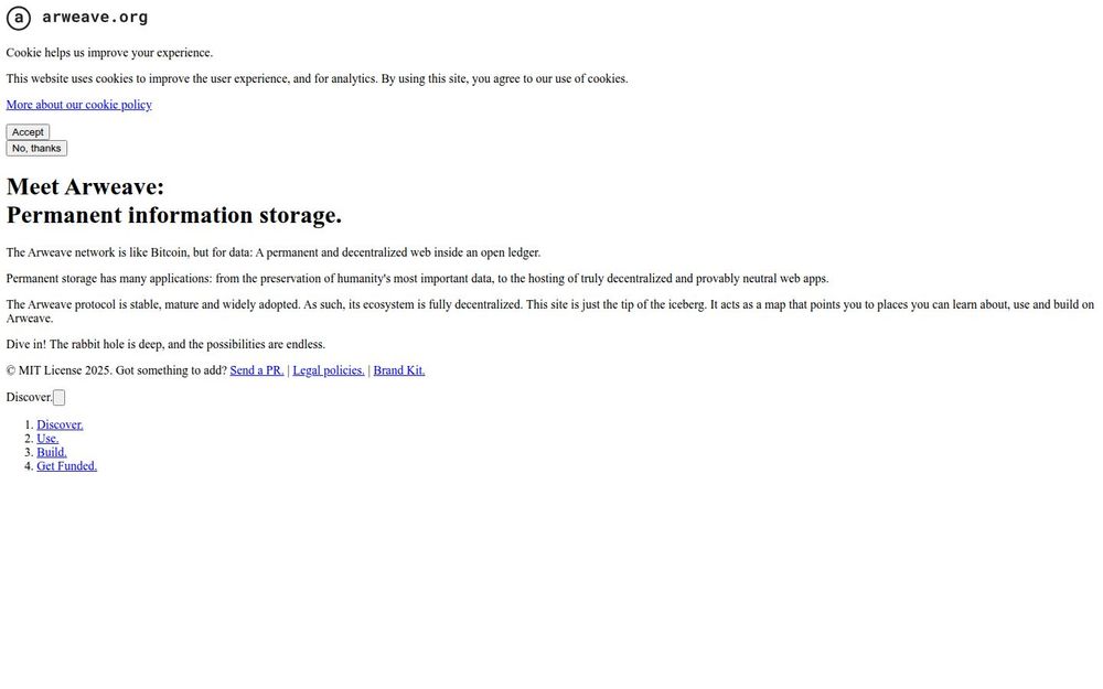 Arweave is a decentralized storage network built to provide permanent, tamper-resistant data storage and an archival layer for the web. Unlike traditional cloud storage or ephemeral distributed storage, Arweave focuses on one-time payment models that secure data for the foreseeable future through a combination of economic incentives and cryptographic proofs. The project positions itself as a ledger for data — a place where applications, files, and records can live permanently without being subject to centralized takedowns, service outages, or business model changes.