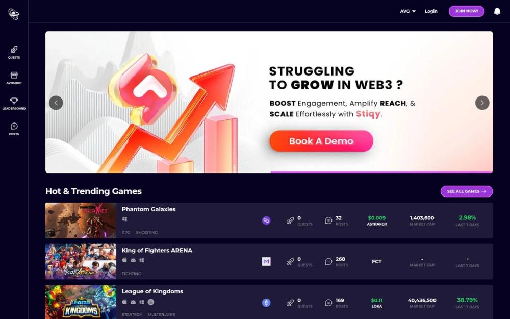 Game Discovery & Catalog: Avocado DAO provides a searchable and browsable catalog of blockchain games. Each game page typically lists genre, supported platforms, available quests, recent community posts, token tickers, and market cap information to help users evaluate titles quickly.