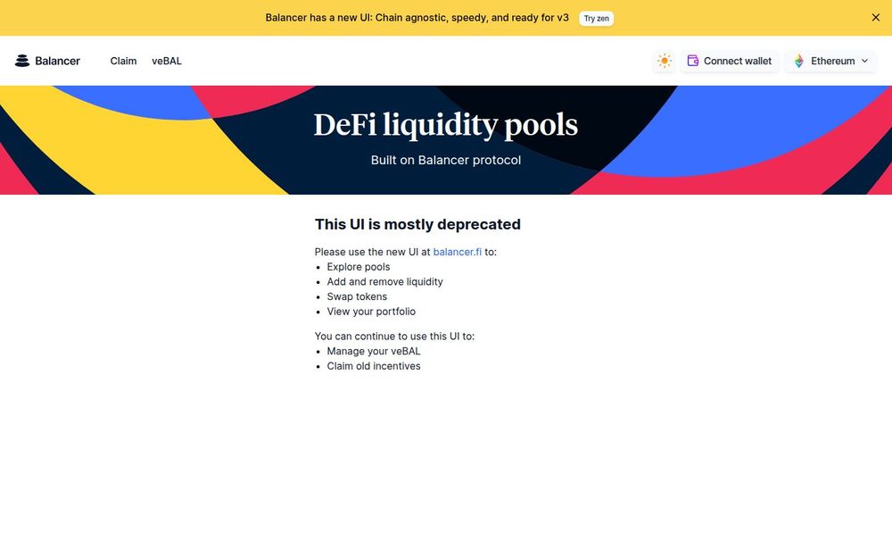 Balancer’s redesigned interface aims to simplify and accelerate interactions with the protocol while supporting the advanced features of v3. By moving to the chain-agnostic balancer.fi experience, users gain faster navigation, modern pool mechanics, and robust analytics. For specialized legacy actions like claiming old incentives or certain veBAL management tasks, the deprecated UI remains available for now, but the new UI should be considered the primary and future-facing entry point for most users.