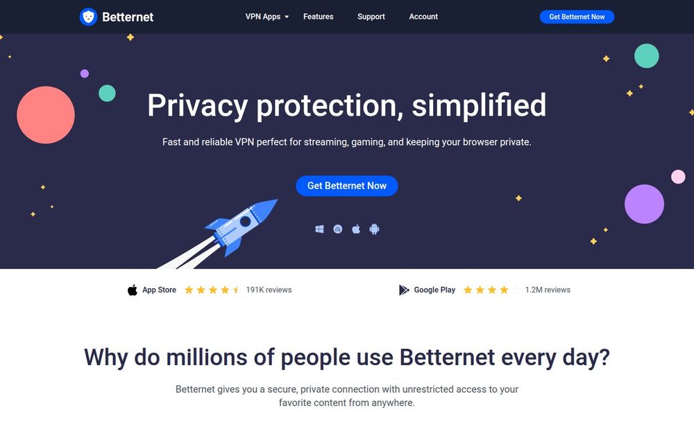 Betternet is appealing for users seeking a low-effort VPN that covers core privacy and unblocking needs: it offers fast, simple protection, works across all major devices, and includes helpful extras like malware protection and server choices for accessing global content. The combination of a free option, no-email onboarding, and an emphasis on streaming performance makes it particularly suitable for casual users, travelers, and anyone who wants quick privacy without complex settings.