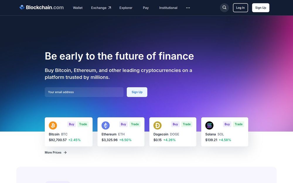 Blockchain (Blockchain.com) is a long-standing cryptocurrency platform that offers a mix of consumer-facing wallet services, on-ramps for buying and trading digital assets, and developer- and institution-focused data and trading tools. The website positions itself as a one-stop destination for people who want to "be early to the future of finance," combining buy/sell/swap convenience, self-custody wallet features, and explorer and API tools that power analytics and integrations. Its offering spans casual users who need an accessible mobile experience and advanced users or institutions who require market data, OTC execution, and structured product capabilities.
