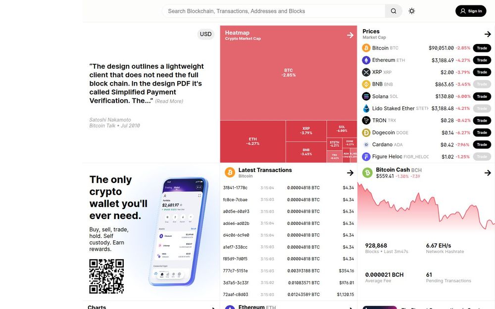 If you need a single entry point to check live blockchain activity and market metrics, Blockchain.com Explorer provides a broad, user-friendly interface.