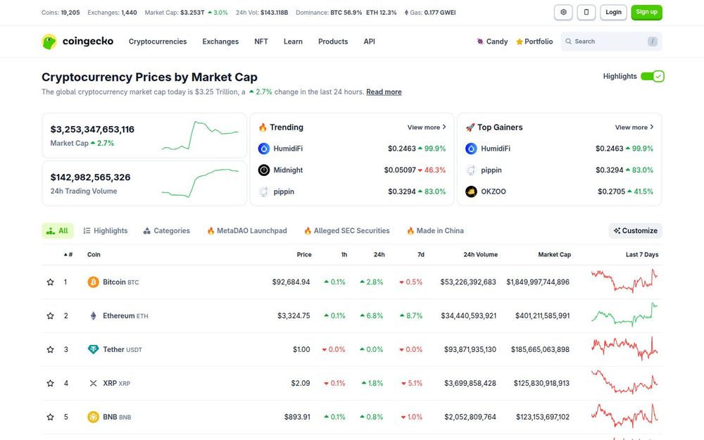2. Comprehensive Market Metrics: For each listed asset, CoinGecko displays market cap, fully diluted valuation (FDV), 24-hour trading volume, supply statistics, and percentage changes over multiple timeframes (1h, 24h, 7d, 30d). These metrics help users evaluate liquidity and relative performance.