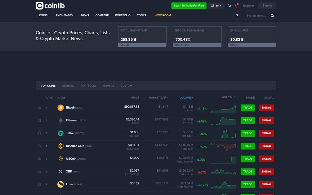 News Aggregation and Signals: Coinlib aggregates cryptocurrency news from multiple sources and displays recent headlines alongside coins. The site also surfaces signal and trade links for users who want to follow alerts or access partner trading platforms.