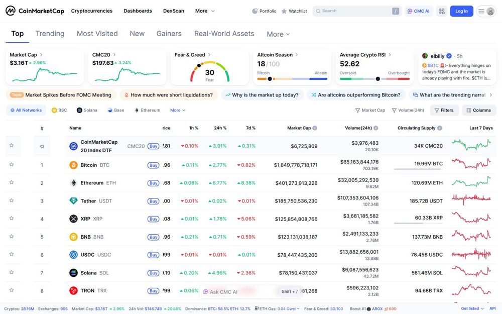 Real-time Price Tracking: CoinMarketCap provides live prices and percent changes across multiple timeframes (1h, 24h, 7d) for thousands of coins and tokens, powered by aggregated exchange data and normalized quotes.