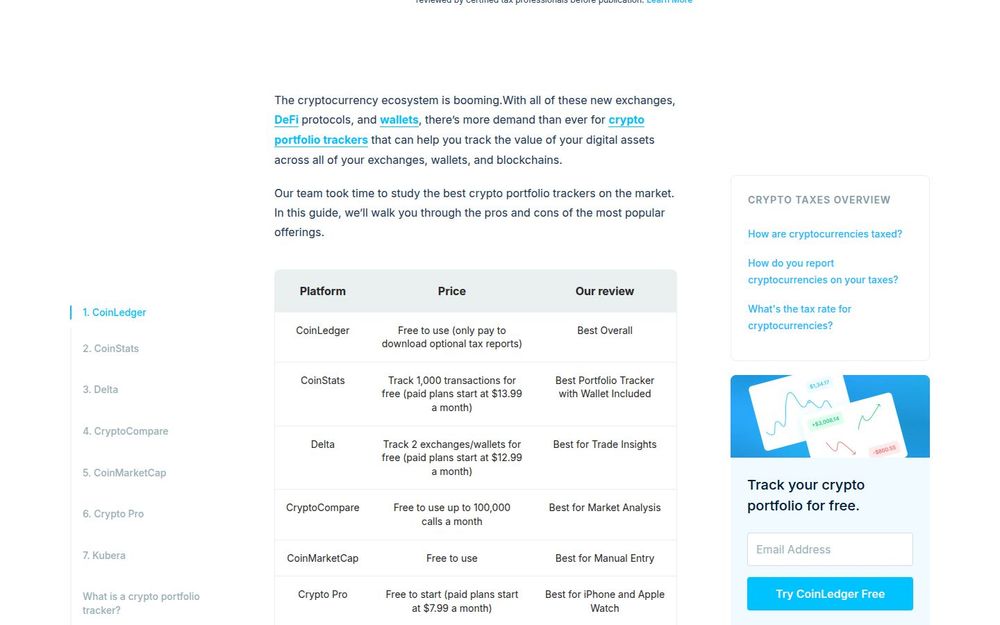 CoinLedger is presented as the overall best option for users who want portfolio tracking tightly integrated with tax automation. It emphasizes user-friendly imports from numerous exchanges and wallets, automated capital gains/loss calculations, and tools for identifying tax-loss harvesting opportunities. CoinLedger offers a free account with paid optional tax report downloads, and is positioned as a one-stop solution for investors who prioritize accurate tax reporting alongside portfolio management.