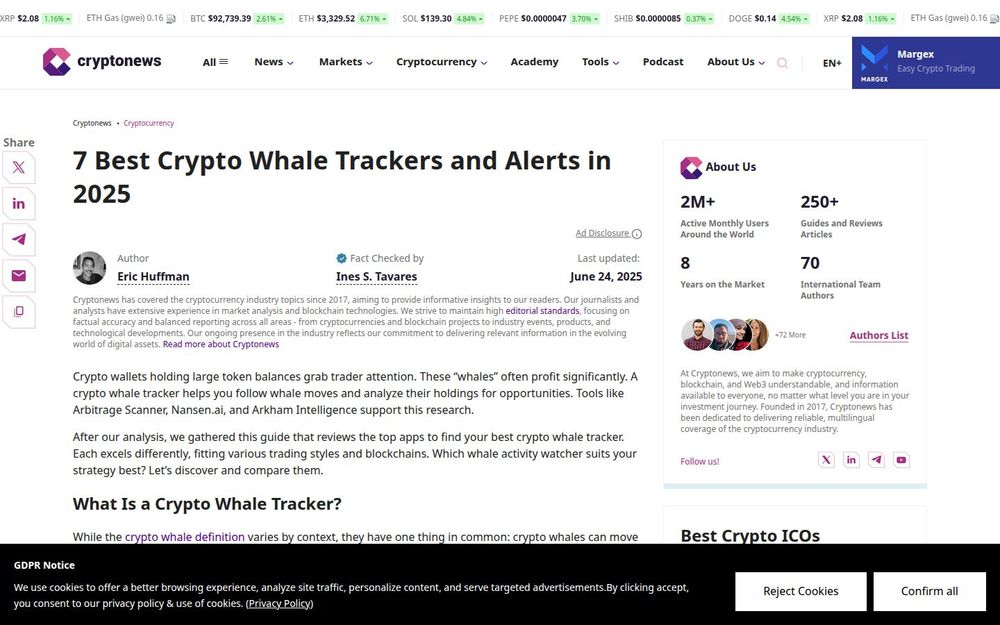 CryptoNews’ guide “7 Best Crypto Whale Trackers and Alerts in 2025” offers a practical, comparative review of tools designed to monitor large crypto wallet movements and notify users of significant transactions. The article distills a busy market into seven recommended platforms, each chosen for a specific strength—arbitrage detection, token inflows/outflows, customizable dashboards, DEX trade monitoring, social feeds, simple alerts, and broad multi-market notifications. The guide explains how whale trackers convert raw on-chain data into actionable alerts and research signals while cautioning readers about common pitfalls.