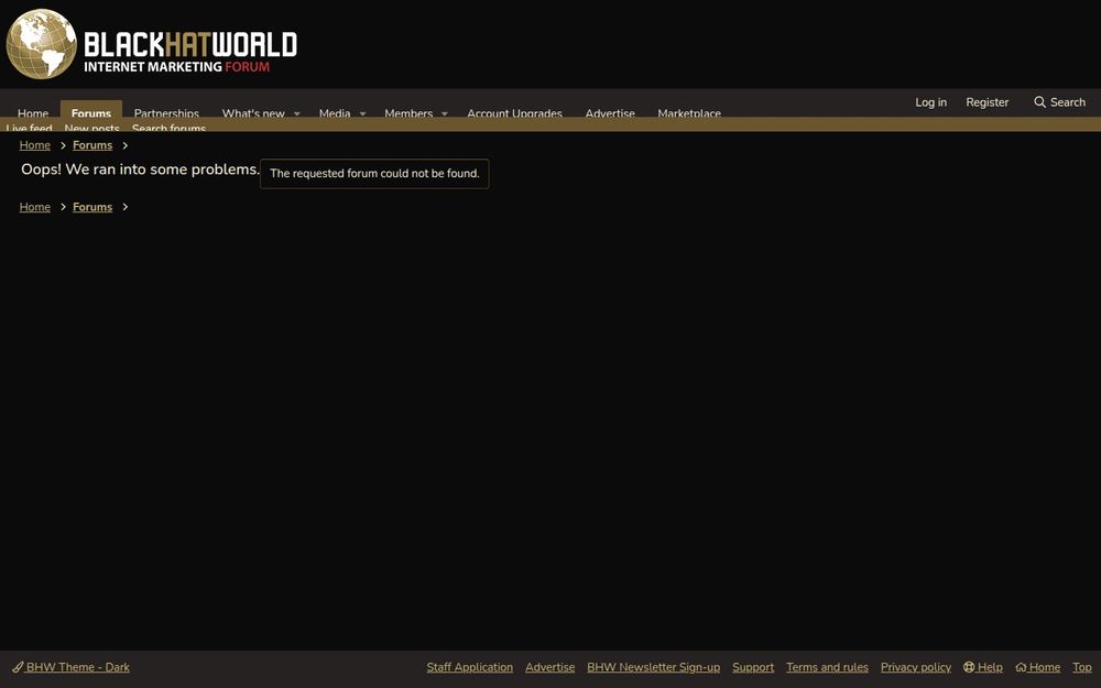 BlackHatWorld is a large, user-driven forum that has historically catered to digital marketers, SEO specialists, affiliate marketers, and a broad set of web entrepreneurs. The platform organizes content into many topical forums and subforums. One such subforum is labeled “cryptocurrency,” though the particular page snapshot provided shows a message saying "Oops! We ran into some problems. The requested forum could not be found." Even when a specific subforum is unavailable, the rest of the site’s navigation — Live Feed, New Posts, Search Forums, Login/Register, and app install guidance — reveals a mature community platform designed for ongoing conversation, resource sharing, and service exchange.