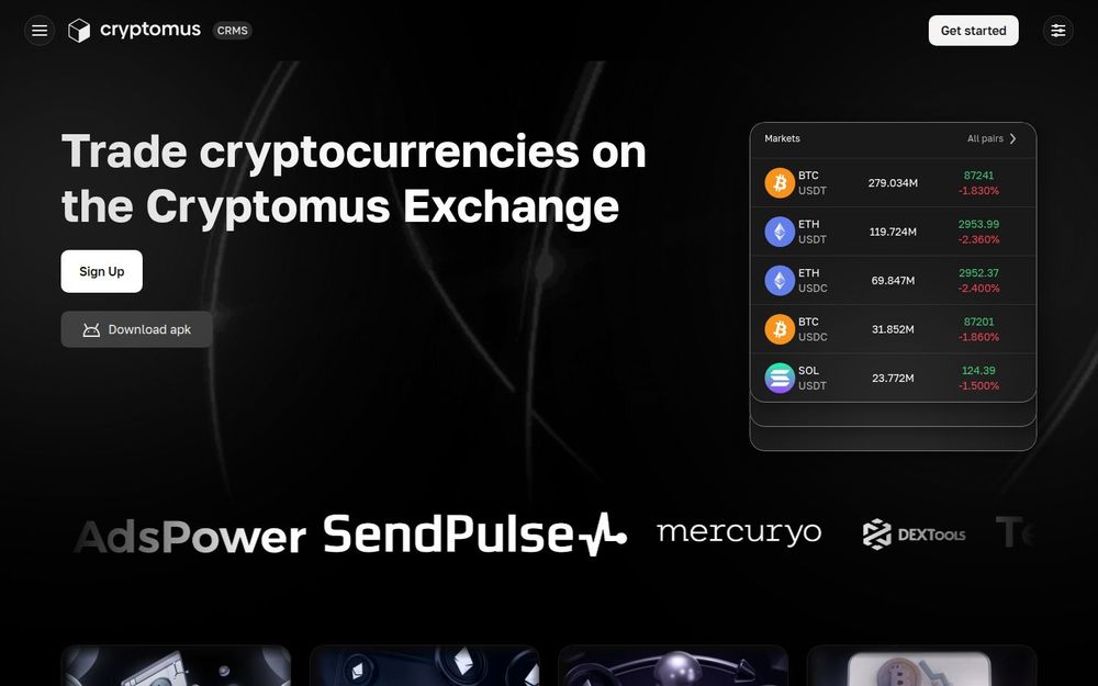 Cryptomus is a cryptocurrency exchange and payment solution designed for traders, merchants, and partners who need a flexible platform for buying, selling, and integrating crypto services. The site combines a trading interface with payment on-ramps (card purchases and P2P), a developer-oriented trading API, and multiple promotional or revenue-sharing programs for affiliates, brokers, and market makers. The platform markets itself on liquidity, competitive rates, and an ecosystem of partnership opportunities that make it attractive to both retail users and professional operators.