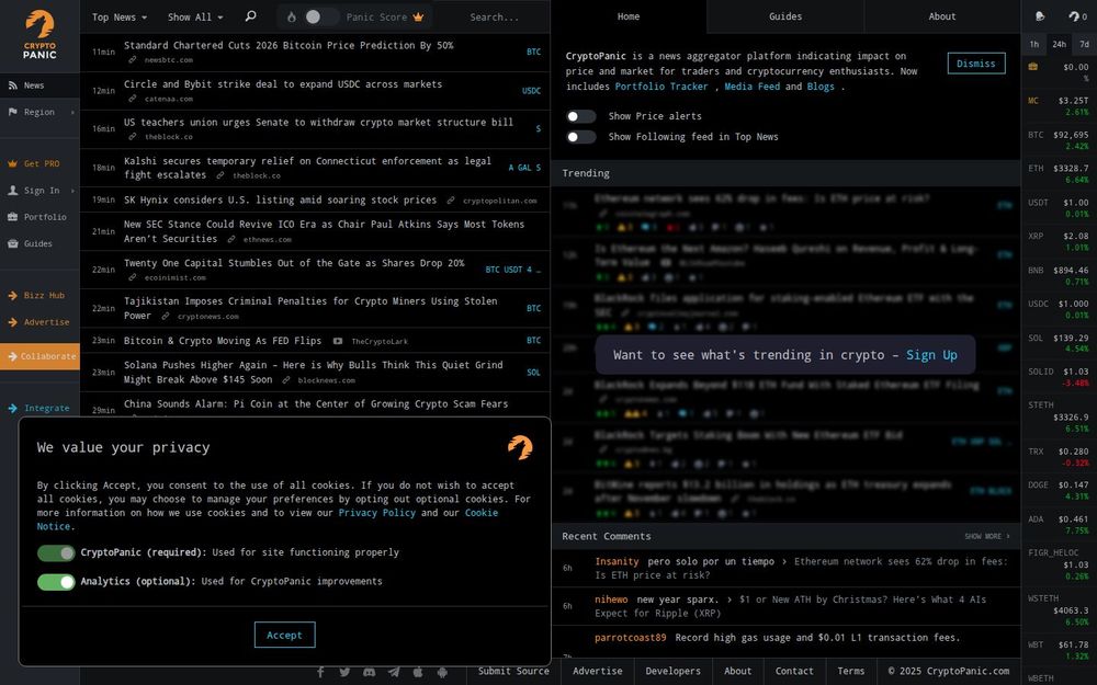 CryptoPanic is a focused news aggregation platform for the cryptocurrency ecosystem that brings market-relevant headlines, social signals, and price context into a single, searchable interface. Its core premise is to help traders, investors, and crypto-curious users stay informed without being overwhelmed by the volume of sources and noise. The site collects content from established news outlets, blogs, Reddit, Twitter, and other sources, and surfaces the most talked-about stories using a numerical Panic Score. In addition to the feed, CryptoPanic includes tools like a Portfolio Tracker, customizable alerts, mobile apps, and multilingual UI support.