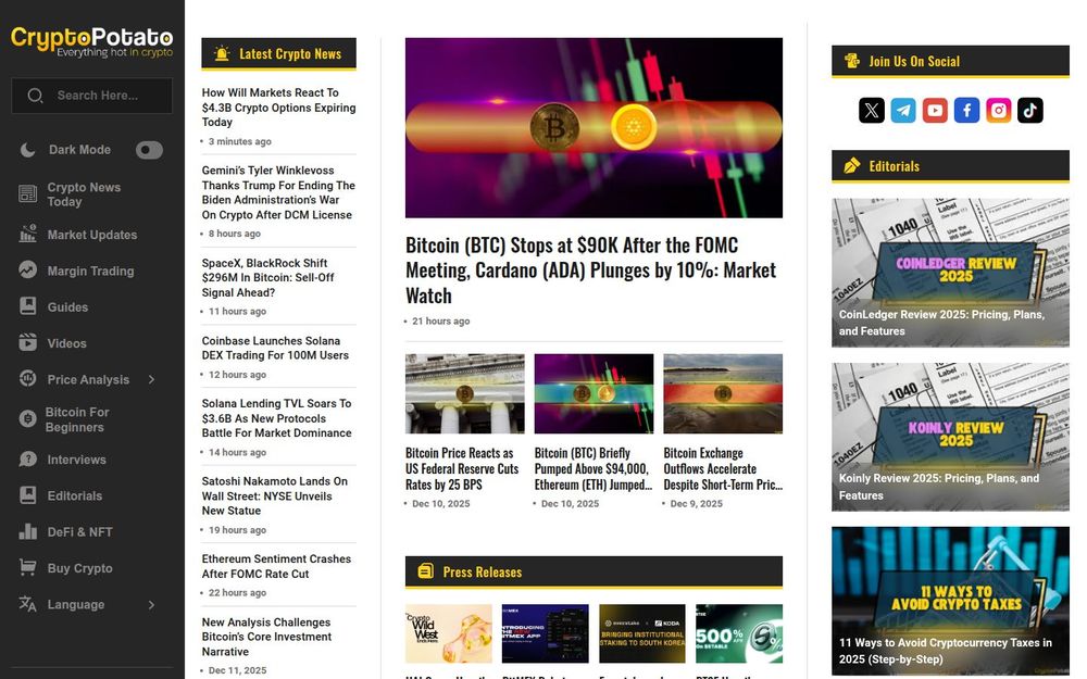 CryptoPotato is an online publication focused on delivering fast, focused, and practical information about cryptocurrencies, blockchain projects, and digital asset markets. Its editorial mix includes breaking news, market watches, price and technical analysis, project deep dives, and industry press releases. The site also publishes educational guides and video content aimed at both newcomers and experienced traders. Coverage often emphasizes major cryptocurrencies such as Bitcoin and Ethereum, while also tracking altcoins, staking, DeFi trends, and institutional developments that influence market sentiment.