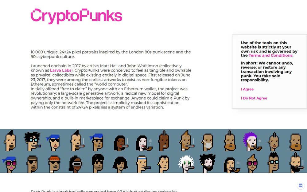 CryptoPunks is one of the earliest and most influential non-fungible token (NFT) projects on Ethereum. Created by artists Matt Hall and John Watkinson (Larva Labs) and released on June 23, 2017, the project consists of 10,000 algorithmically generated 24×24 pixel portraits. Designed to feel as tangible and collectible as traditional physical artworks yet exist entirely on-chain, CryptoPunks helped establish the cultural, technical, and market foundations for digital ownership. The collection draws visual inspiration from the London 1980s punk scene and the 1990s cyberpunk aesthetic, blending retro pixel art with a conceptual rethinking of portraiture and identity.