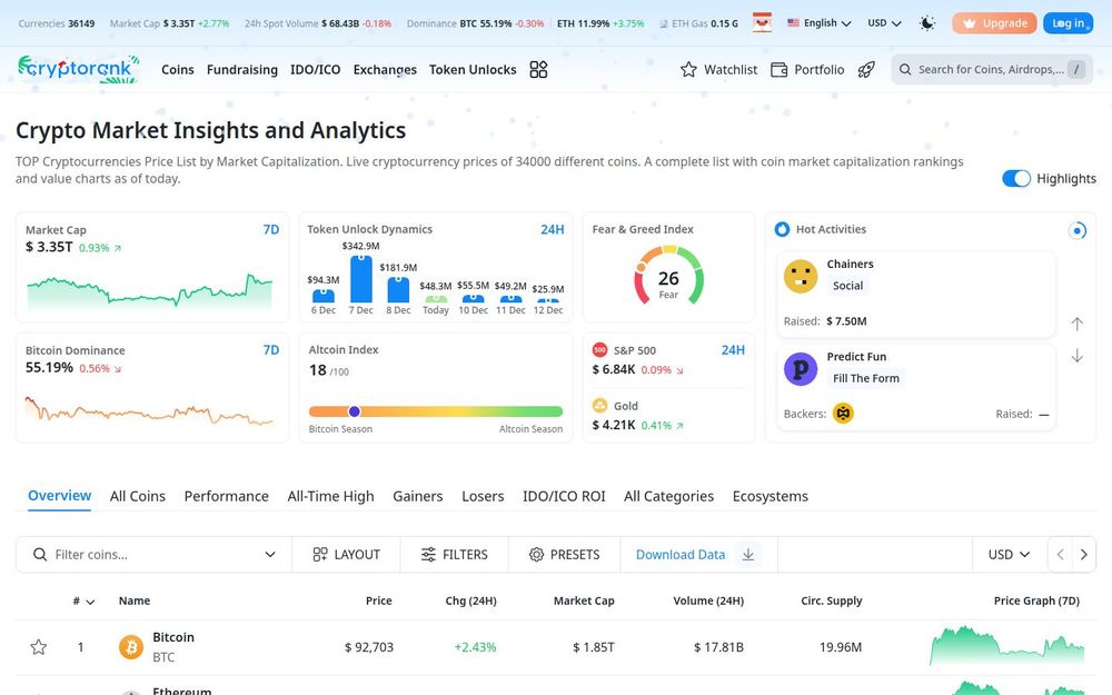 Fundraising & Token Sale Tracking: CryptoRank tracks funding rounds, VC investments, and upcoming IDO/ICO launches. Users can browse recent funding activity, analyze fundraising trends, and inspect launchpad performance and ROI across projects.