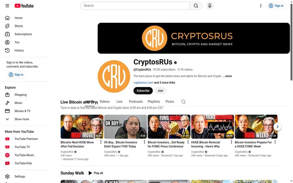 Curated Playlists & Themed Shows: CryptosRUs organizes content into playlists such as "Live Bitcoin and Cryptocurrency News," "Sunday Walk," and "Ask George," making it easy for users to follow specific series or revisit similar-format videos on demand.