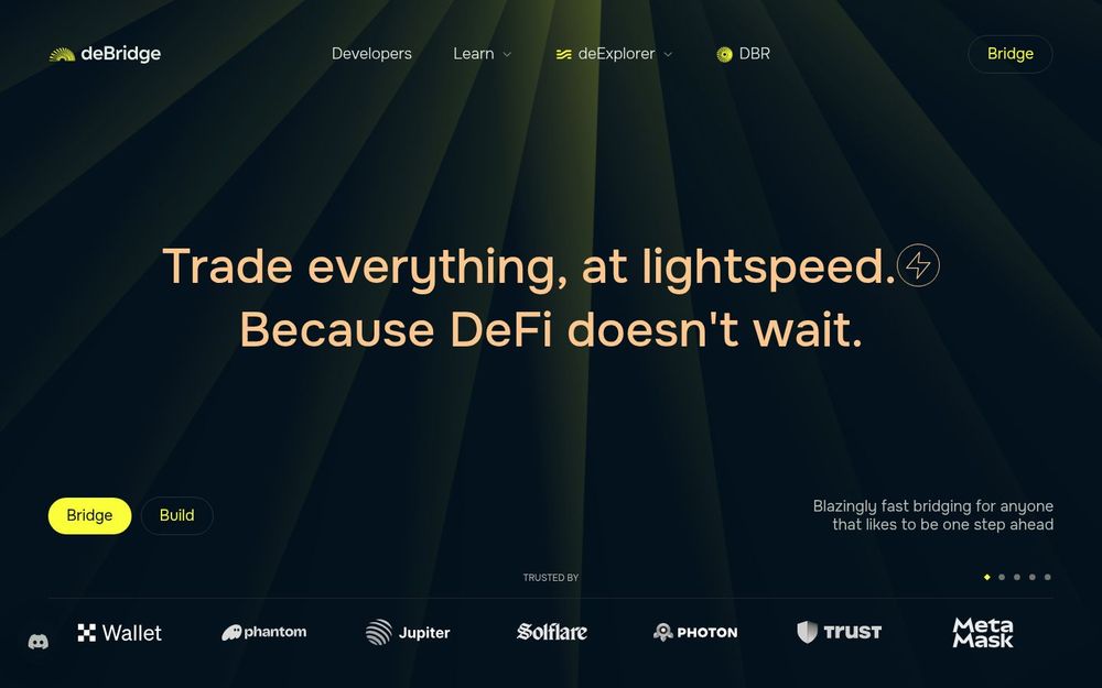deBridge is a cross-chain liquidity and bridging protocol designed to move tokens and value between disparate blockchains quickly, securely, and with developer-first integration options. It positions itself as a low-latency, high-uptime infrastructure layer for DeFi, enabling both end users and institutional partners to bridge assets, route liquidity, and build cross-chain features. The product emphasizes speed (sub-two-second median settlements), low spreads, strong audit coverage, and a partner ecosystem including wallets, exchanges, and other DeFi primitives.