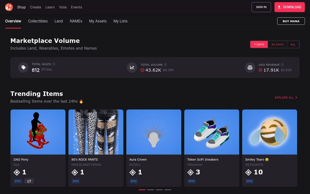Creators: Designers and developers can publish collections, list items for sale, and monetize in-world experiences by selling wearables, emotes, or LAND-based access.