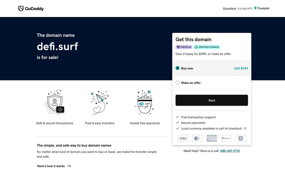 Premium listing and verification: The domain is labeled as a premium and verified asset. This helps instill buyer confidence and implies the domain has perceived market value for branding or product use in the DeFi sector.
