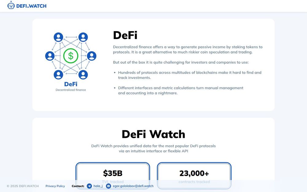 DeFi Watch is a unified analytics and discovery platform focused on making decentralized finance more accessible, transparent, and manageable. It consolidates data from hundreds of protocols across dozens of blockchains and surfaces it in a single interface and via a developer-friendly API. The service is built to address common pain points in DeFi: fragmented information, inconsistent metrics, and the operational burden of tracking many smart contracts and positions manually. By combining live and historical data, security assessments, and wallet-aware recommendations, DeFi Watch helps investors and product teams find better opportunities while managing risk and simplifying accounting.