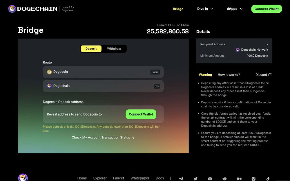 - The high minimum deposit (100 DOGE) makes this bridge more suitable for larger transfers rather than small tests.