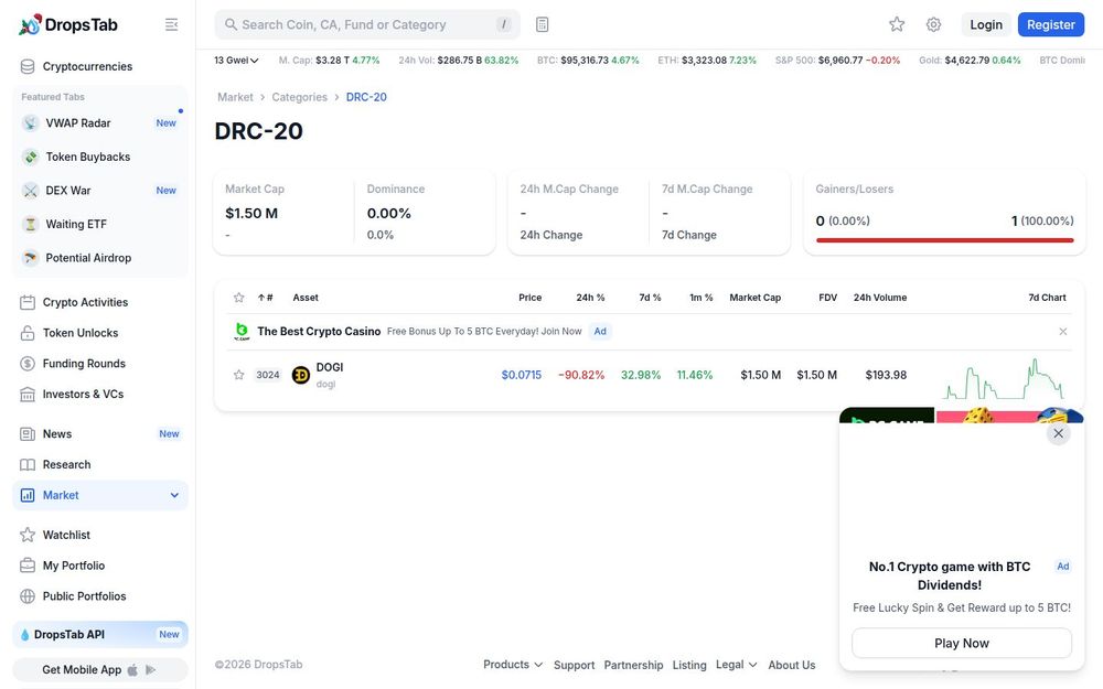 DropsTab’s category page for DRC-20 tokens blends concise visualizations with core market indicators to speed up token discovery. For traders and researchers who need a quick comparative view of dozens of tokens, the combination of sortable metrics and sparklines reduces friction in identifying candidates for further analysis. The surrounding DropsTab ecosystem — watchlists, portfolio tools, research, and API access — helps bridge the gap between initial discovery and ongoing monitoring.