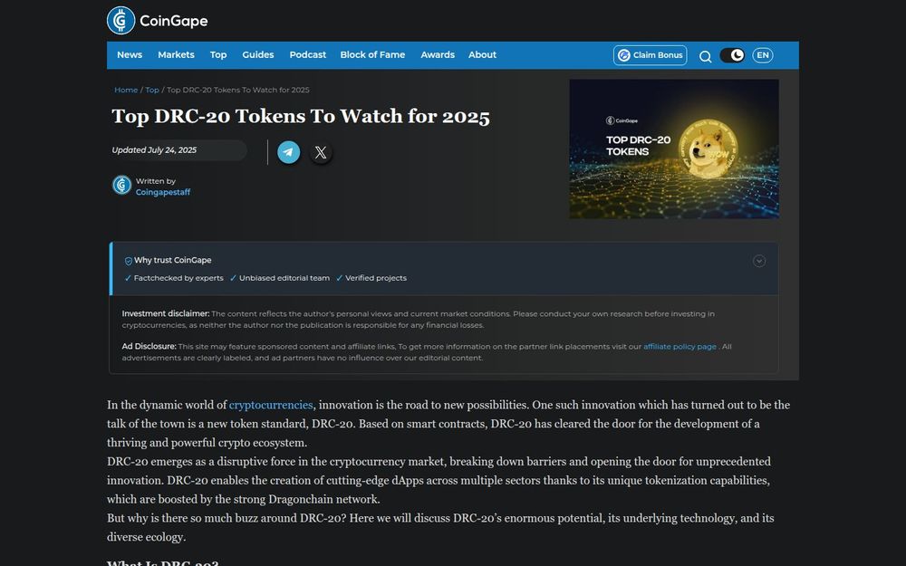 CoinGape repeats common industry precautions: the DRC-20 space remains nascent and speculative. Projects may carry high volatility and limited liquidity. Audits, team transparency, and community governance records are essential due diligence points.