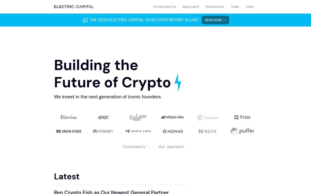 Electric Capital is a venture capital firm focused on the future of crypto and blockchain technology. The firm emphasizes an engineering-led investment thesis, seeking teams and founders who combine strong technical capabilities with scalable product visions. The website functions both as a portfolio showcase and a research hub: it highlights investments, shares deep-dive reports (notably the annual Developer Report), and publishes timely analyses, podcasts, and multimedia content designed to inform founders, operators, and investors about trends in the crypto ecosystem.