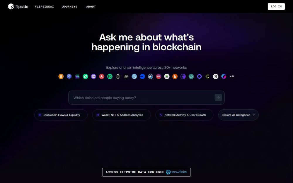 Flipside’s value is in reducing the friction of on-chain analysis. By combining a broad multi-chain dataset with a categorized library of questions and seamless data access, it helps teams move from hypothesis to insight quickly. The pre-built questions lower the barrier to entry for less technical users while integrations like Snowflake enable data teams to scale analyses within familiar environments. Whether you need to monitor stablecoin liquidity, investigate wallet-level behavior, or measure network adoption, Flipside provides a balanced mix of ready-made analytics, granular data access, and multi-chain context.
