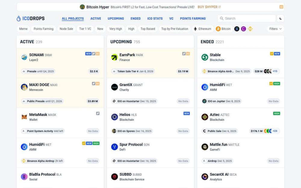 ICO Drops is a web-based calendar and research hub focused on token sales and launch events across the cryptocurrency industry. It compiles and displays concise project cards and lists for Active, Upcoming, and Ended token sales, and augments those entries with visual badges, platform icons (for example Ethereum, Bitcoin, Solana), sale types (ICO, IEO, presale, airdrop, NFT ICO), and fundraising metrics. The site is designed to give investors, analysts, and community members a quick but informative snapshot of a token sale’s timing, scale, and backers.