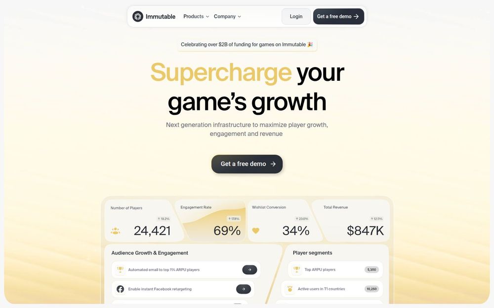 Immutable is a specialized growth platform for games that aims to reduce the high failure rate at game launch by turning anonymous traffic into identifiable, high-value players. Framed as “next generation infrastructure,” Immutable focuses on pre-launch and early launch stages where wishlists, player attribution, and audience segmentation are critical. The platform promotes measurable uplift in conversion, engagement, and monetization by combining identity, landing experiences, and analytics into a single workflow.