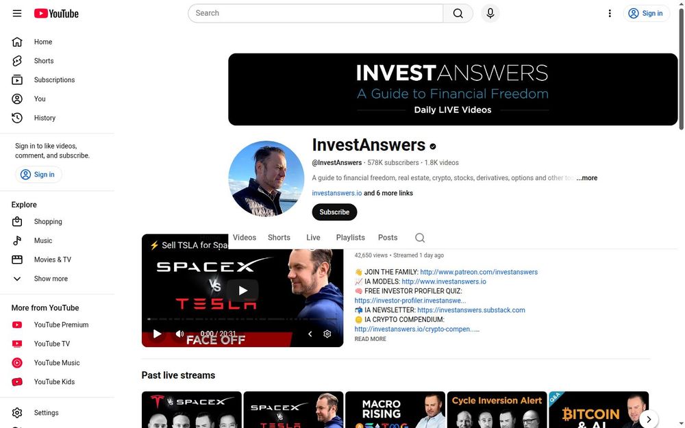 InvestAnswers is a well-known YouTube channel and broader content brand focused on investing education, market commentary, and actionable insights spanning cryptocurrencies, stocks, derivatives, real estate, and macro trends. The channel combines quantitative observations with narrative-driven analysis to explain how structural shifts—like the rise of Bitcoin, AI adoption, and capital flows—can create asymmetric investment opportunities. Videos include live streams, topical deep dives, playlists on core subjects (e.g., Tesla, crypto, retirement strategies), and companion resources such as an investor profiler quiz, IA Models, and a newsletter.