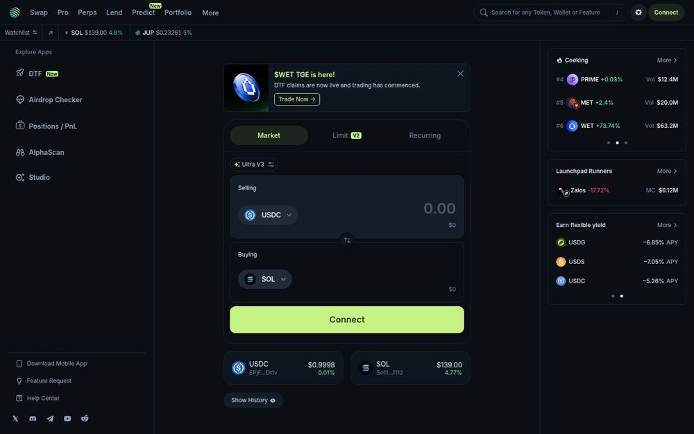 Jupiter brands itself as “The Solana Superapp,” combining multiple decentralized finance functions under a single web interface. Its homepage and navigation indicate core verticals such as Swap, Pro, Perps, Lend, Portfolio, and Prediction, making it clear the platform aims to serve both casual traders and more advanced DeFi users. Users access the platform by connecting a Solana wallet, then can perform token swaps, trade perpetuals, deposit into lending products, track investments, and explore new token launches and trending assets.