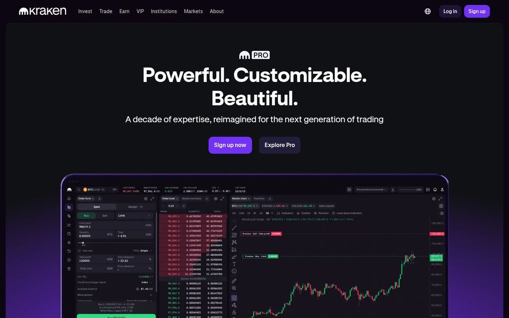 Kraken Pro is a professional-grade cryptocurrency trading platform built to serve active traders, institutional users and anyone seeking deeper market functionality than a basic retail exchange. It brings together spot, margin, perpetual futures and fixed-maturity derivatives, plus staking and portfolio tools, under one responsive web and mobile experience. The product highlights include a highly customizable workspace, real-time market feeds, and access to OTC services and commission-free stock trading for eligible US users.
