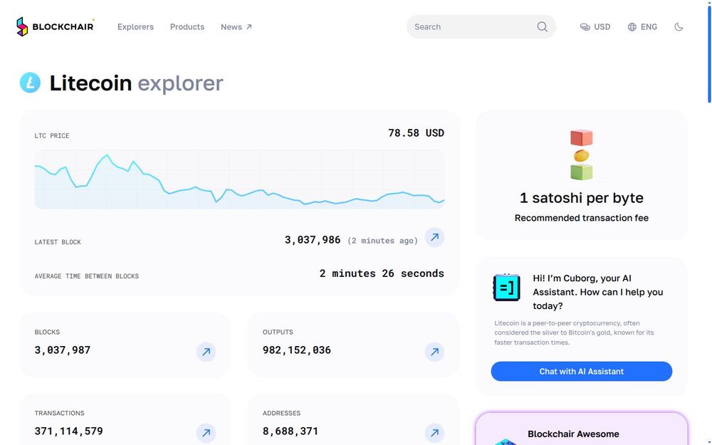 Blockchair’s Litecoin page is a comprehensive explorer and analytics dashboard focused on the Litecoin (LTC) blockchain. It brings together live market pricing, block and transaction data, chain statistics, and auxiliary services in a single interface. Users can view the latest block, average block time, circulating supply, market capitalization, and historical charts, while also accessing mempool status, recommended transaction fees, and network health indicators. The page functions both as a public explorer for on-chain queries and as an entry point to Blockchair’s broader product ecosystem such as APIs, charts, and node explorers.