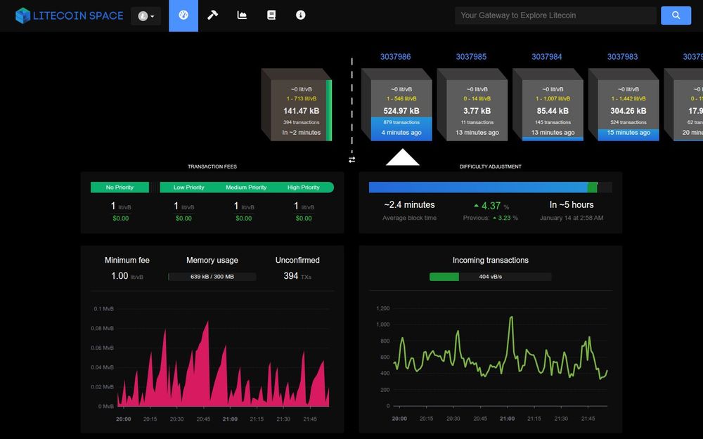 Litecoin Space is a dedicated Litecoin block explorer and chain analytics portal that helps users, developers, and miners inspect on-chain activity and fee dynamics in real time. The site aggregates block and transaction metadata, mempool statistics, fee-priority guidance, and difficulty adjustment information into a compact interface. Whether you are checking the status of a recent transaction, estimating the fee required for timely confirmation, or monitoring mining pool activity and block propagation, Litecoin Space provides the core data needed to understand what’s happening on the Litecoin network.