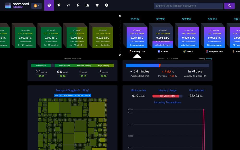 Network Metrics and Tools: Includes auxiliary information like average block time, difficulty adjustment forecasts, halving countdowns, memory usage, incoming transaction rates, and recent replacements. These telemetry items are useful for both everyday users and technical operators.