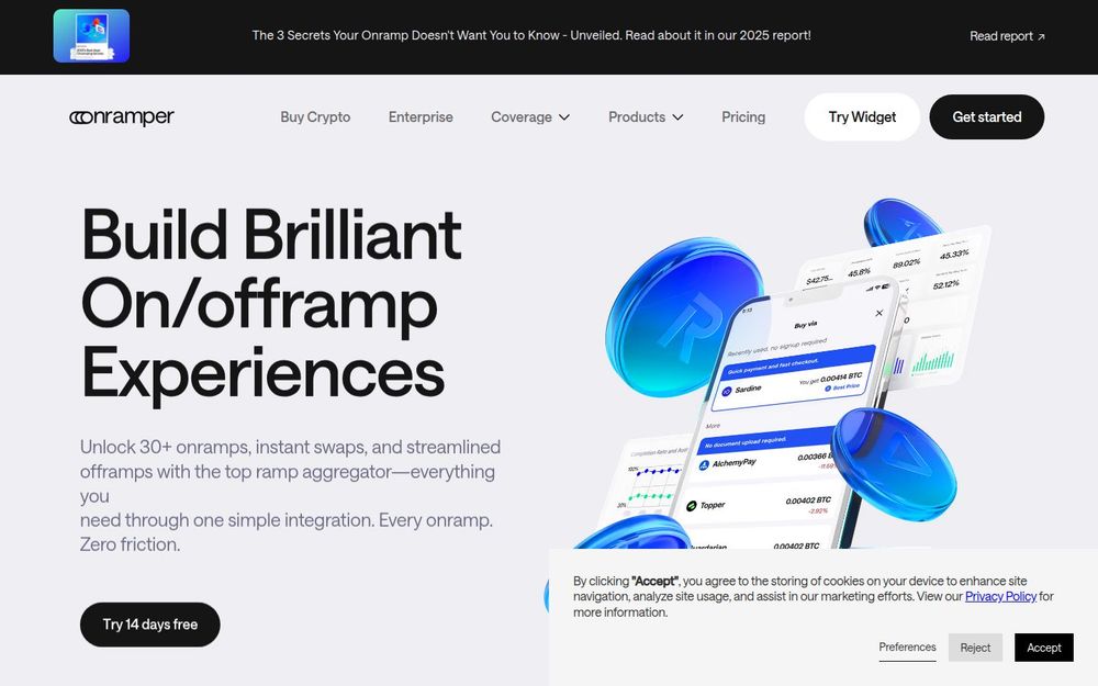 Onramper promotes a 14-day free trial so teams can test coverage, routing performance and conversion improvements. The company states it typically does not add fees on top of onramp quotes, instead monetizing through referral arrangements with partner onramps in some cases.