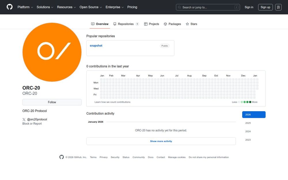 Protocol Specification and Documentation: The GitHub account is positioned to host formal specifications, README documentation, and usage guides that describe how the ORC-20 Protocol is intended to work.