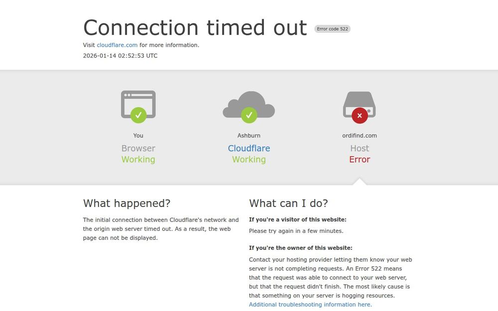 OrdiFind currently returns a Cloudflare 522 "Connection timed out" error, which prevents the website's normal content and functionality from being displayed. A 522 indicates that while Cloudflare successfully connected to the origin server, the origin did not complete the request in time. This landing page provides diagnostic guidance and immediate next steps for visitors and site administrators. Because the origin content is inaccessible, the details below combine what is visible from the error page with reasonable, clearly labeled assumptions about the kind of service a site named "OrdiFind" might provide.
