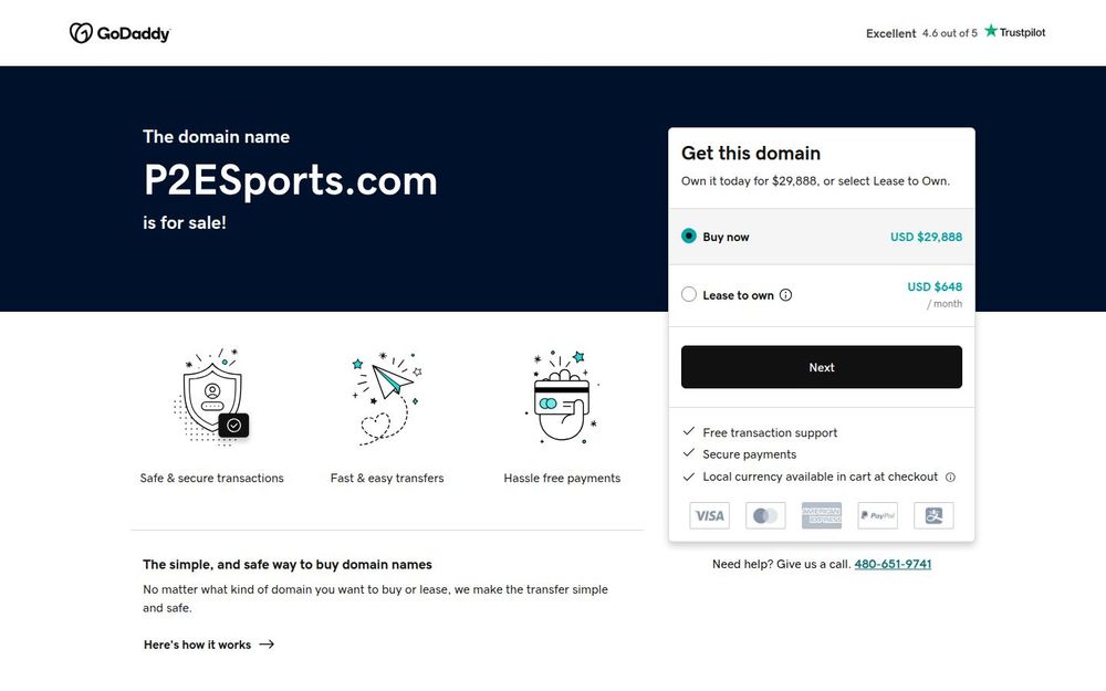 P2ESports.com is a premium domain listed for sale through GoDaddy’s marketplace. The listing presents the name as an available brand asset, offering potential buyers a straightforward path to acquire the domain either through a one-time purchase or a lease-to-own plan. The page highlights transaction conveniences such as secure payment processing, support for multiple payment methods, localized currency display at checkout, and direct customer assistance to simplify the transfer of domain ownership.