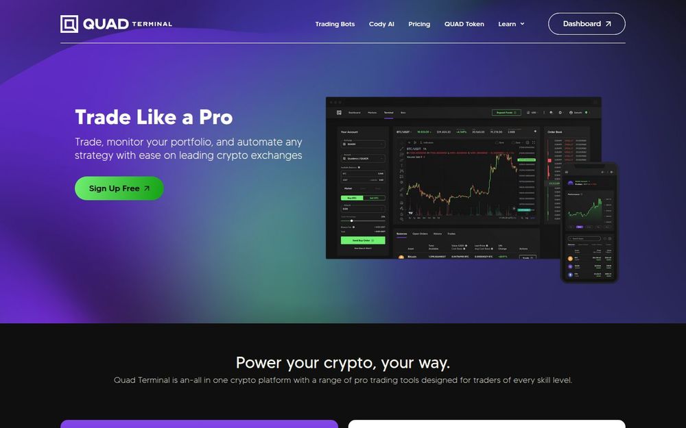Quad Terminal is an integrated crypto trading terminal focused on providing traders with a unified environment for execution, automation, and portfolio management. Built to support multi-exchange access, the platform aggregates advanced charting, automated bot strategies, portfolio analytics, and utility token incentives into a single web-based terminal and companion mobile experience. Quad Terminal targets a wide audience—from beginners seeking simple bot templates to experienced traders who want fine-grained control over strategies and order types—while emphasizing a security-first approach to protect user accounts and data.