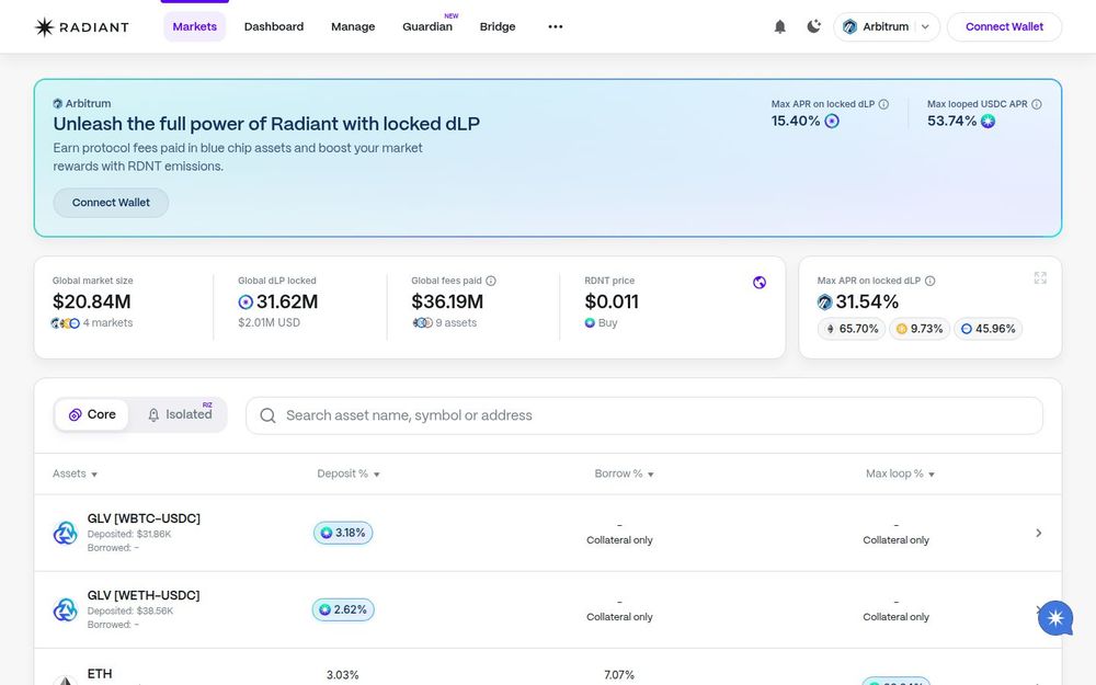 Multi‑market & Multi‑asset Support: Radiant offers multiple market configurations (e.g., Core, Isolated) and supports numerous assets across different chains (the UI shows chain icons and named markets). Each market displays deposited and borrowed amounts, deposit % and borrow % rates, and additional metrics such as max loop percentages.