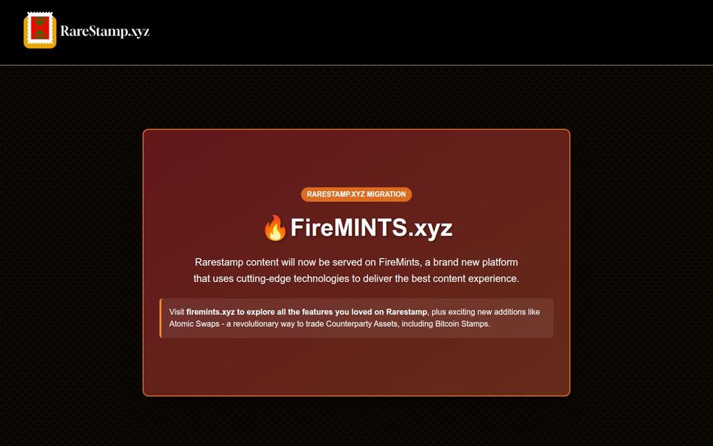 RareStamp’s transition to FireMINTS represents a strategic effort to modernize how Bitcoin Stamps and Counterparty assets are presented and traded. With a focus on trustless trading, curated presentation, and community continuity, the migration is designed to offer collectors, creators, and enthusiasts an improved and future-ready platform while retaining the ethos and curated content that defined RareStamp.