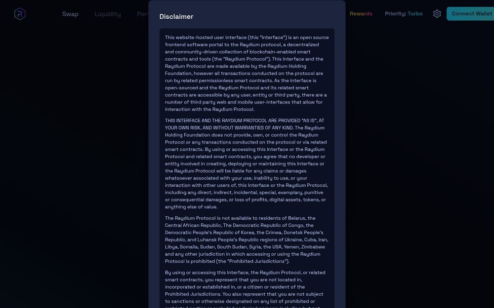 Raydium emphasizes that the interface is provided “as is” and that the Raydium Holding Foundation does not control on-chain contract execution. The platform explicitly lists Prohibited Jurisdictions where the protocol should not be accessed and requires users to represent they are not residents of those regions. It also highlights that it is an open-sourced interface and that multiple third-party frontends may interact with the same smart contracts.