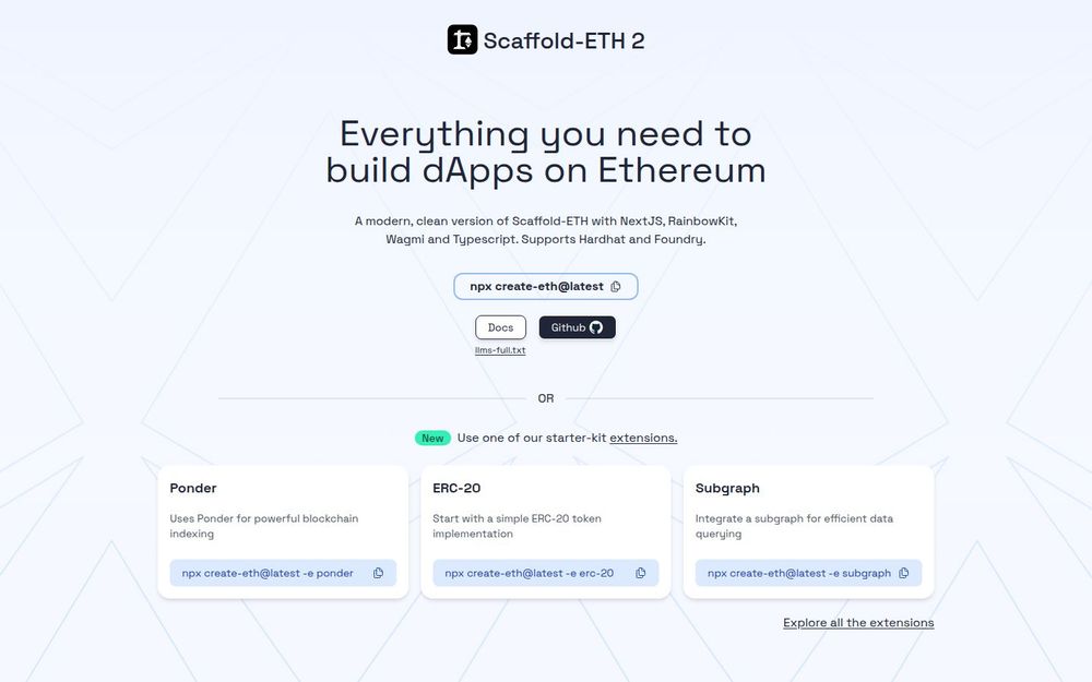 - 4. Modular Extensions: Installable extensions (e.g., Ponder indexing, ERC-20 starter, Subgraph) act as starter-kits to add pages, contracts, or integrations at project creation time.