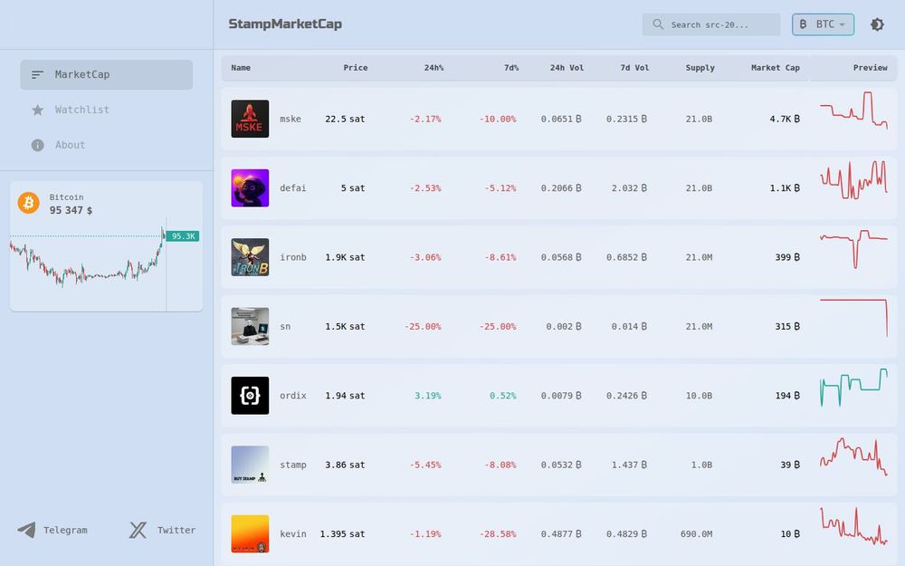 StampMarketCap is a specialized market data aggregator that focuses on Bitcoin-native tokens, ordinals, and satoshi-denominated assets. Unlike broader cryptocurrency aggregators that center on Ethereum or cross-chain tokens, StampMarketCap emphasizes the unique attributes of the Bitcoin ordinals ecosystem: prices quoted in satoshis, block-based minting information, and on-chain activity metrics expressed in BTC. The site’s straightforward table layout allows users to quickly scan projects by price, recent percentage changes, trading volumes, and holder counts—making it a practical resource for collectors, traders, and explorers of the ordinals space.