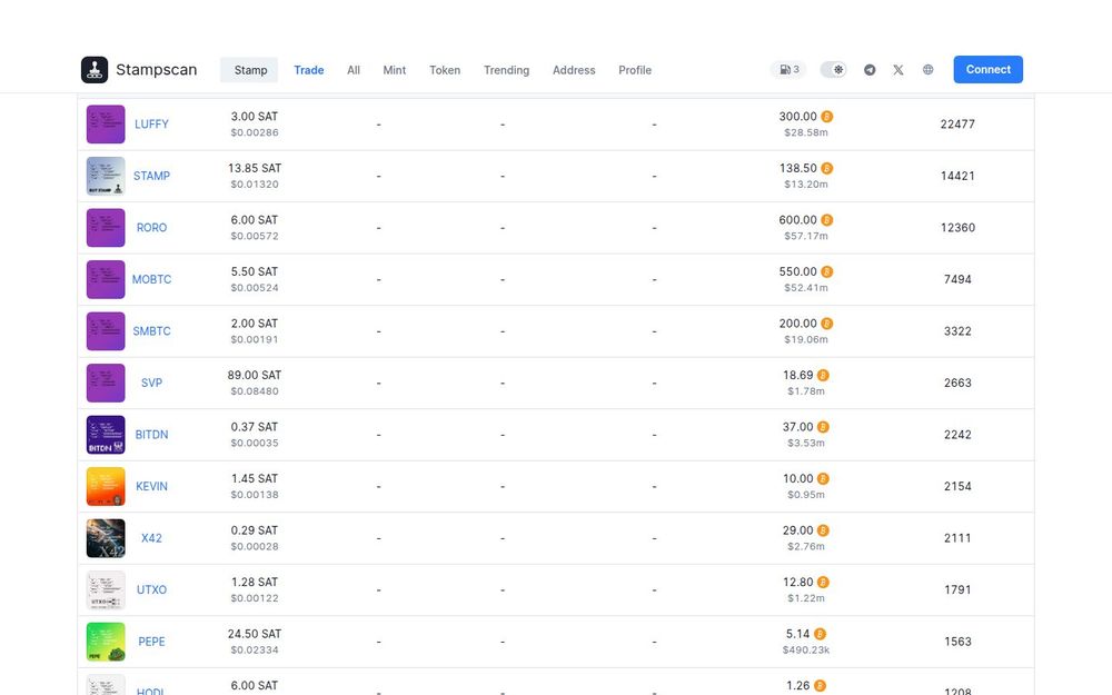 Token Discovery and Listing: Browse a comprehensive table of tokens with thumbnail stamp images, token tickers, floor price (in sats and USD), market cap, volume over selectable periods, and holder counts. The listings make it easy to scan many projects at once and identify trending assets.
