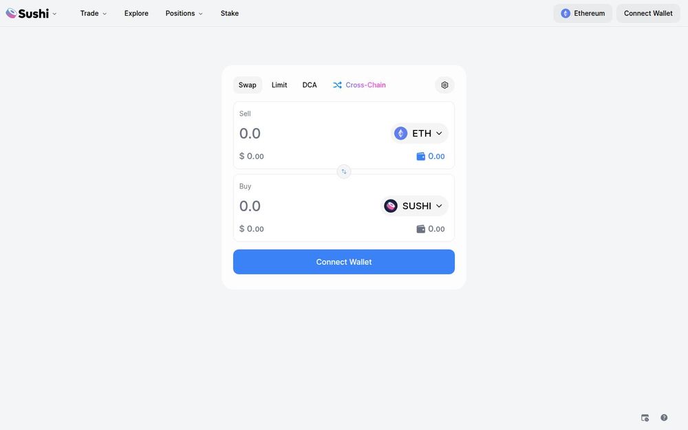 Sushi is a decentralized exchange frontend that connects users to the SushiSwap protocol and its multi-chain trading capabilities. It provides an accessible web application for swapping tokens, placing limit orders, executing dollar-cost averaging strategies, and performing cross-chain swaps. The interface works with common Web3 wallet connectors such as WalletConnect, allowing users to manage assets on Ethereum and other supported networks. Key trade information—including price impact, estimated maximum and minimum received tokens, routing source, and network fees—is presented directly in the swapping UI to support informed decision-making.